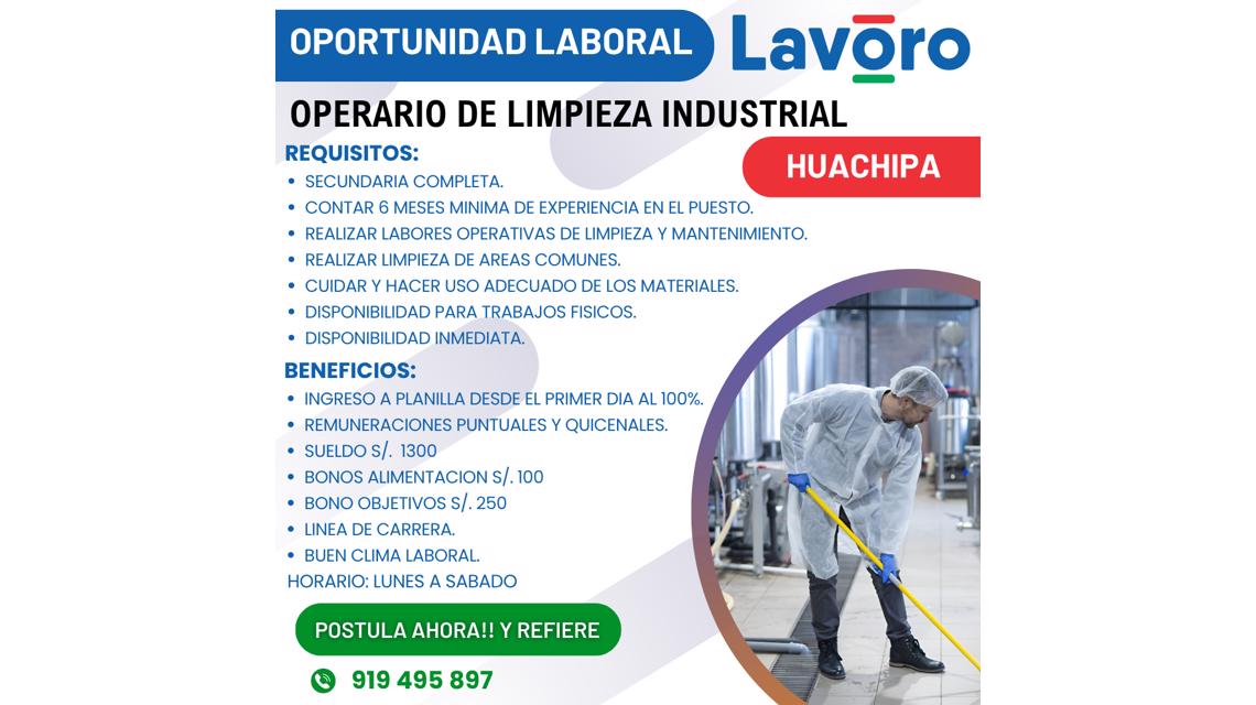 Por encargo de uno de nuestros clientes, una importante empresa ; nos encontramos en la búsqueda de: PERSONAL DE LIMPIEZA INDUSTRIAL / HUACHIPA.
